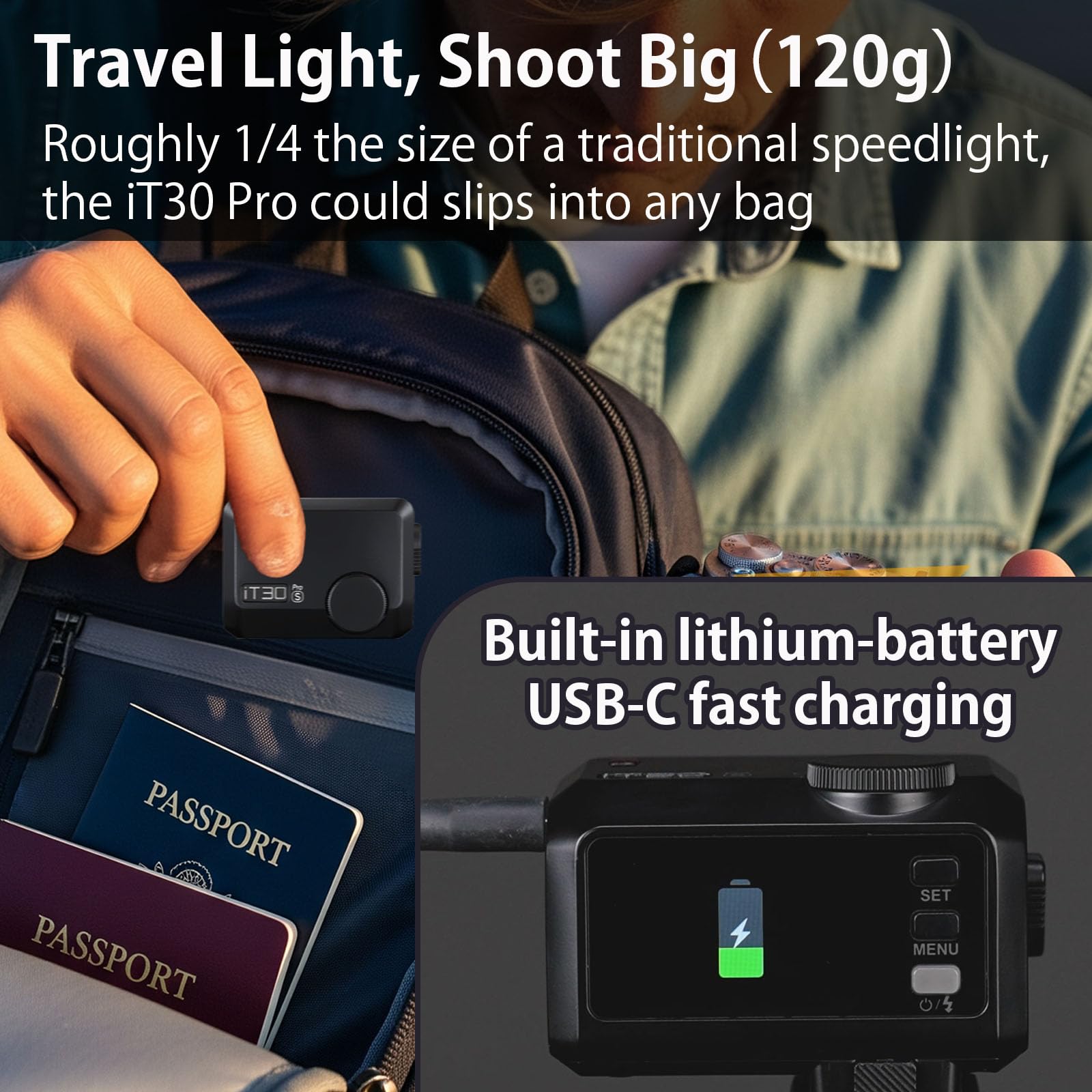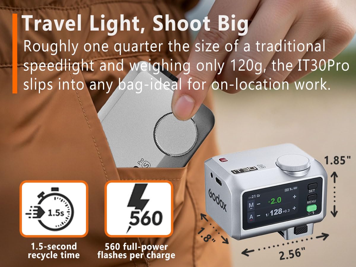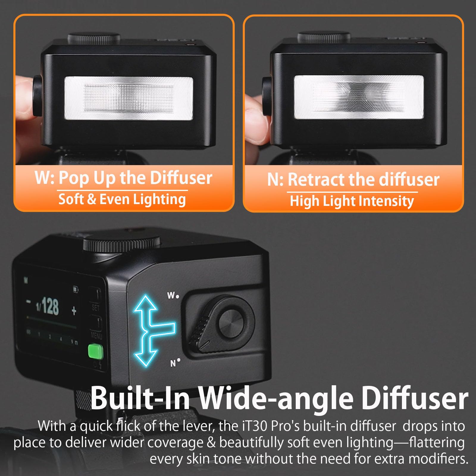 Compatibility Warning: This IT30PRO flash may not fit in a camera cage due to hot shoe obstruction. Firmware Update: A new firmware update is now available for the Godox IT30 PRO. Please visit GODOX-SITE to download and install the latest version.This update enhances the screen lock feature. The unlocking method has been changed to a long press of the 'SET' button, preventing accidental parameter changes caused by inadvertent touches.